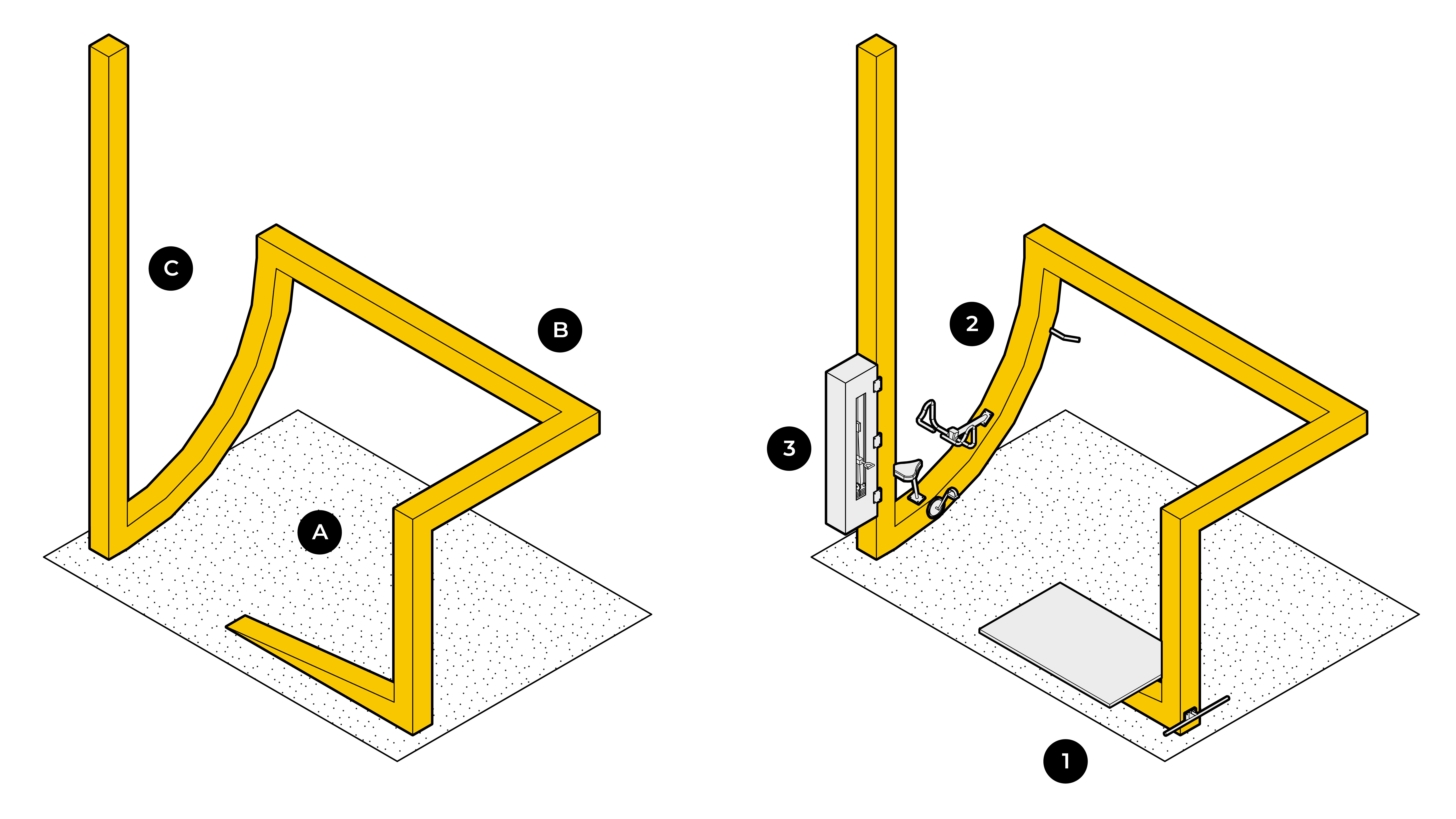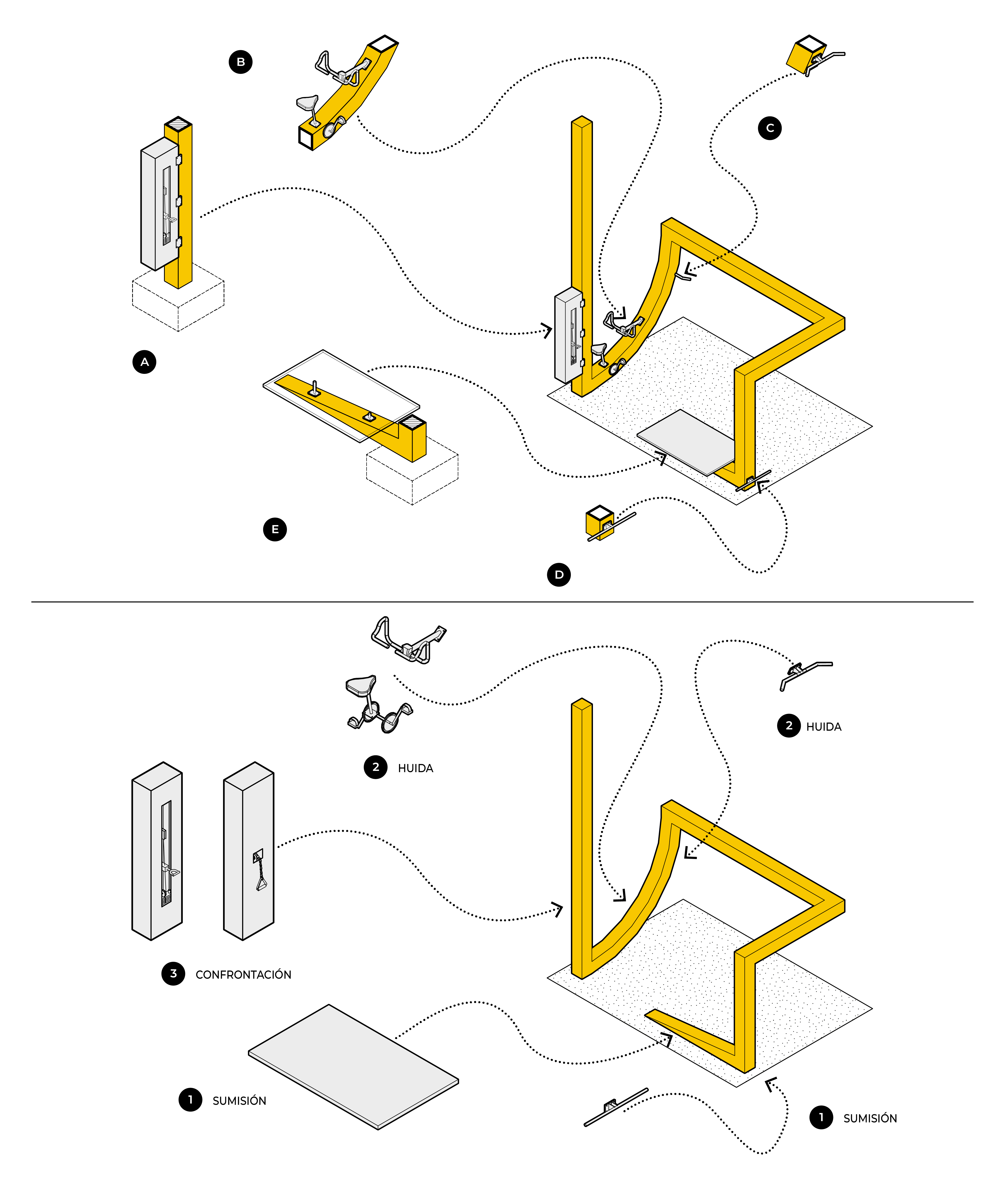 El proyecto se propone como una estructura que toma la forma de una escultura abstracta y geométrica, que se materializa citando tropos arquitectónicos, haciendo un guiño a la formación de numerosos de los artistas que generaron el ya mencionado panorama escultórico. Una sola línea que sugiere (a) un recinto, (b) un pórtico y (c) un obelisco, con una forma que insinúa una escultura modernista autónoma. Esta escultura propone una hibridación con otra estructura axiomática prevalente en la ciudad: el gimnasio al aire libre.