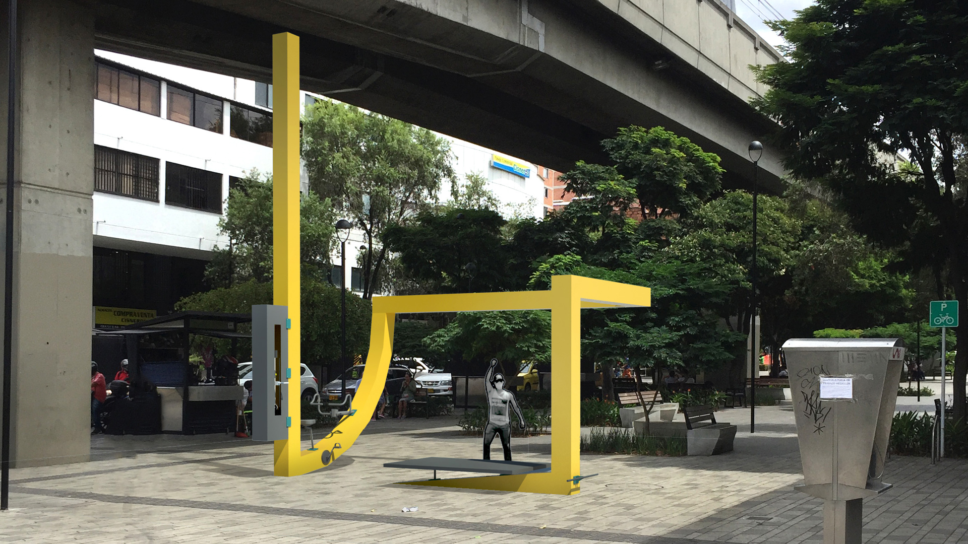 Monumento a la protesta, es una escultura interactiva que surge de una hibridación entre las formas típicas de una escultura abstracta y otra estructura prevalente en la ciudad: el gimnasio al aire libre. Proponiendo un juego de mediación y contradicción entre la tradición de escultura moderna de la ciudad, la relación entre los vestigios de las manifestaciones públicas, y la apropiación de los ciudadanos de este tipo de mobiliario urbano utilitario.