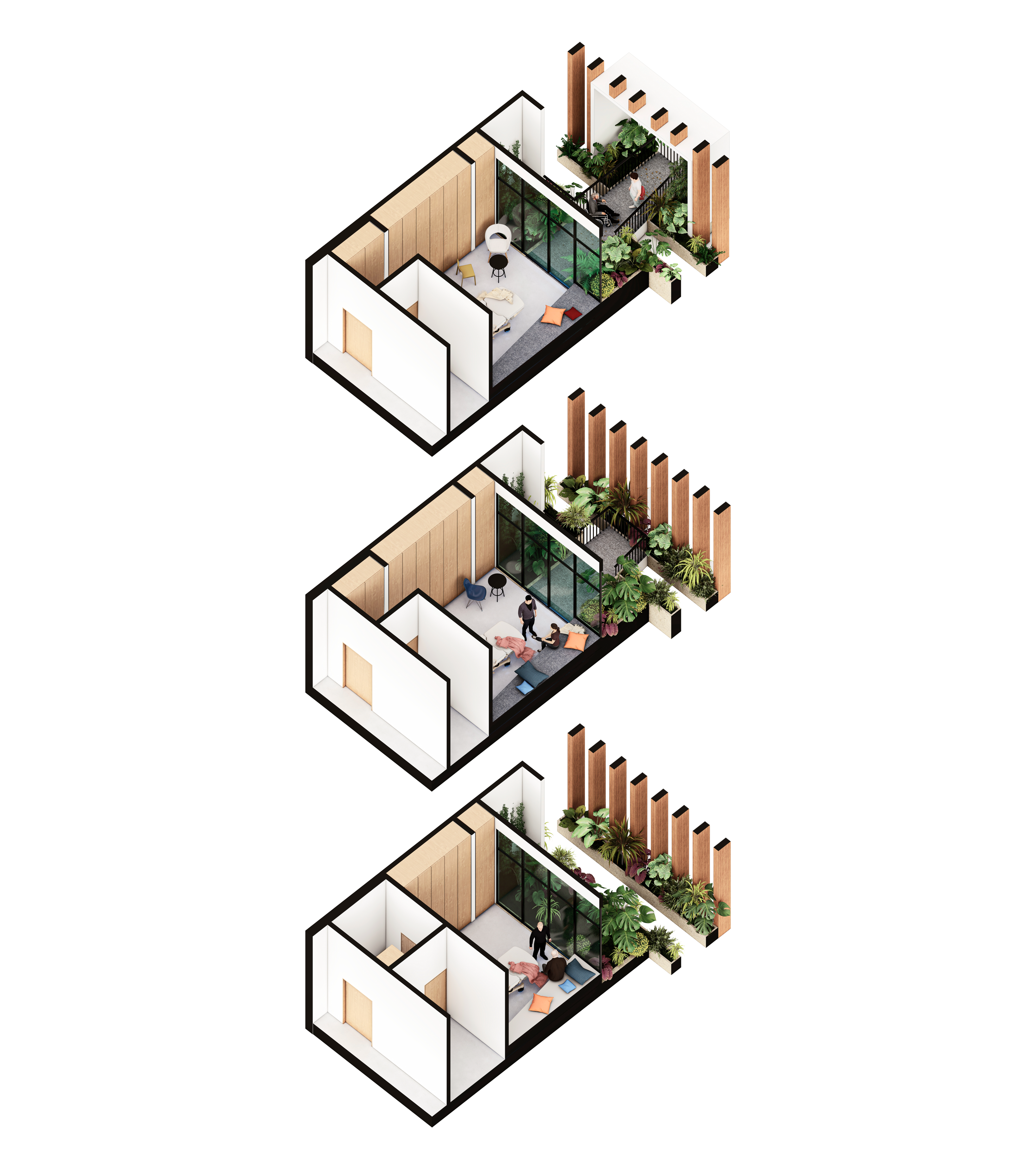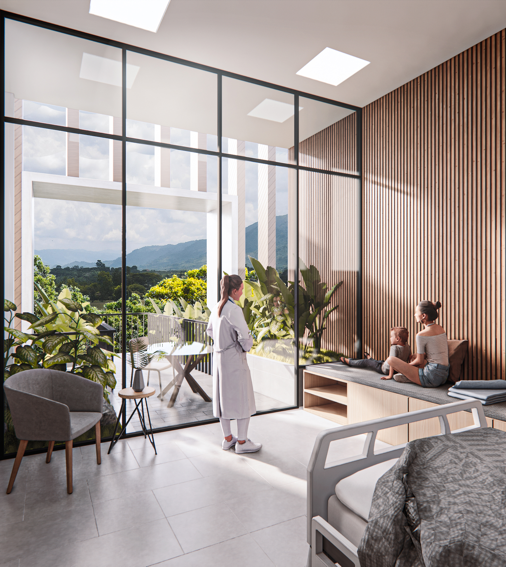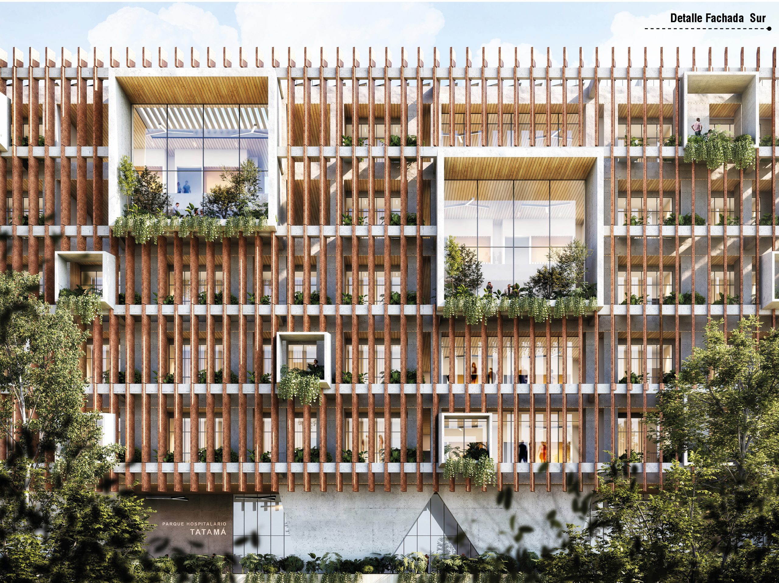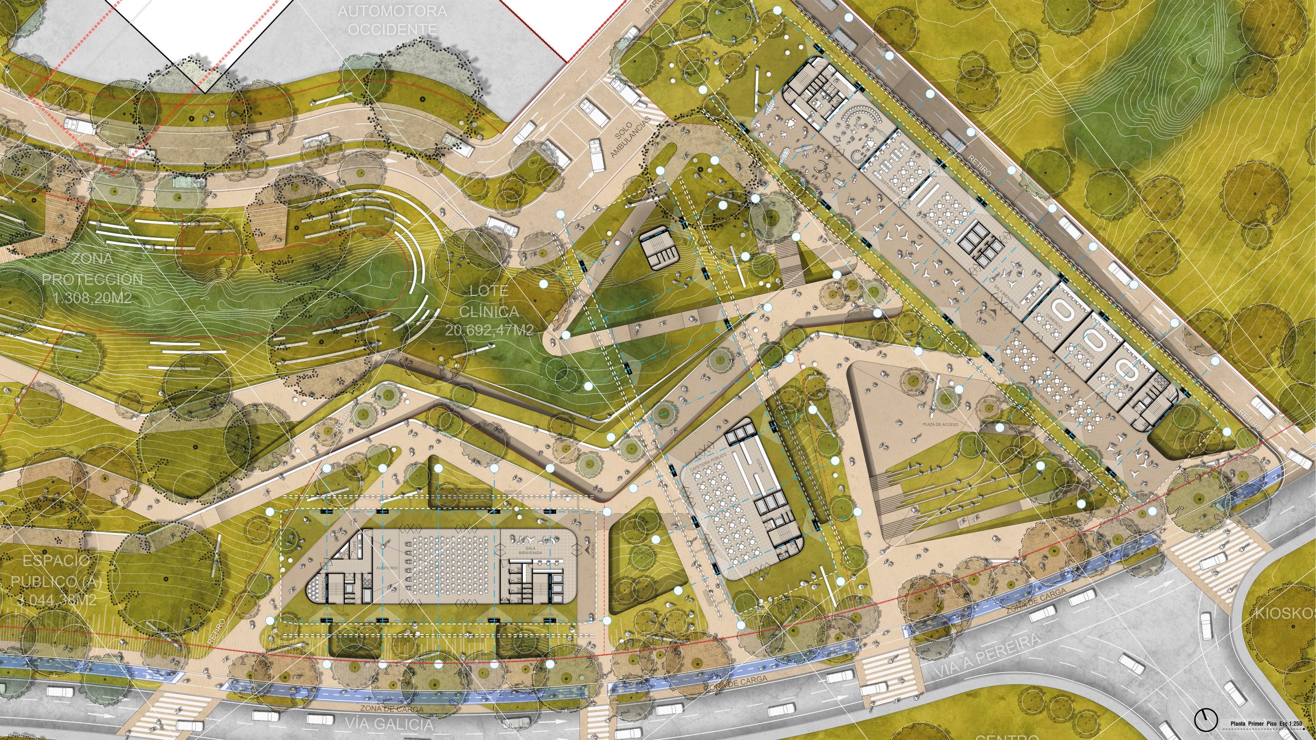 El parque hospitalario aprovecha las preexistencias del sistema ecológico presente en el lote y las potencia, se convierte en el motor principal del proyecto, recorriendo e ingresando a la totalidad de los espacios del conjunto. Así, no solo la luz natural penetra a todos los lugares, y el viento cruza las áreas públicas, sino que la vegetación se hace presente en cada parte del proyecto, acercándose en todo momento hasta cada uno de los tres actores de la salud: pacientes, cuidadores y personal de la salud, construyendo un paisaje verde cercano a cada uno de los habitantes del edificio, un interior que se vuelve exterior, conectándose con el paisaje cafetero que rodea Pereira.
