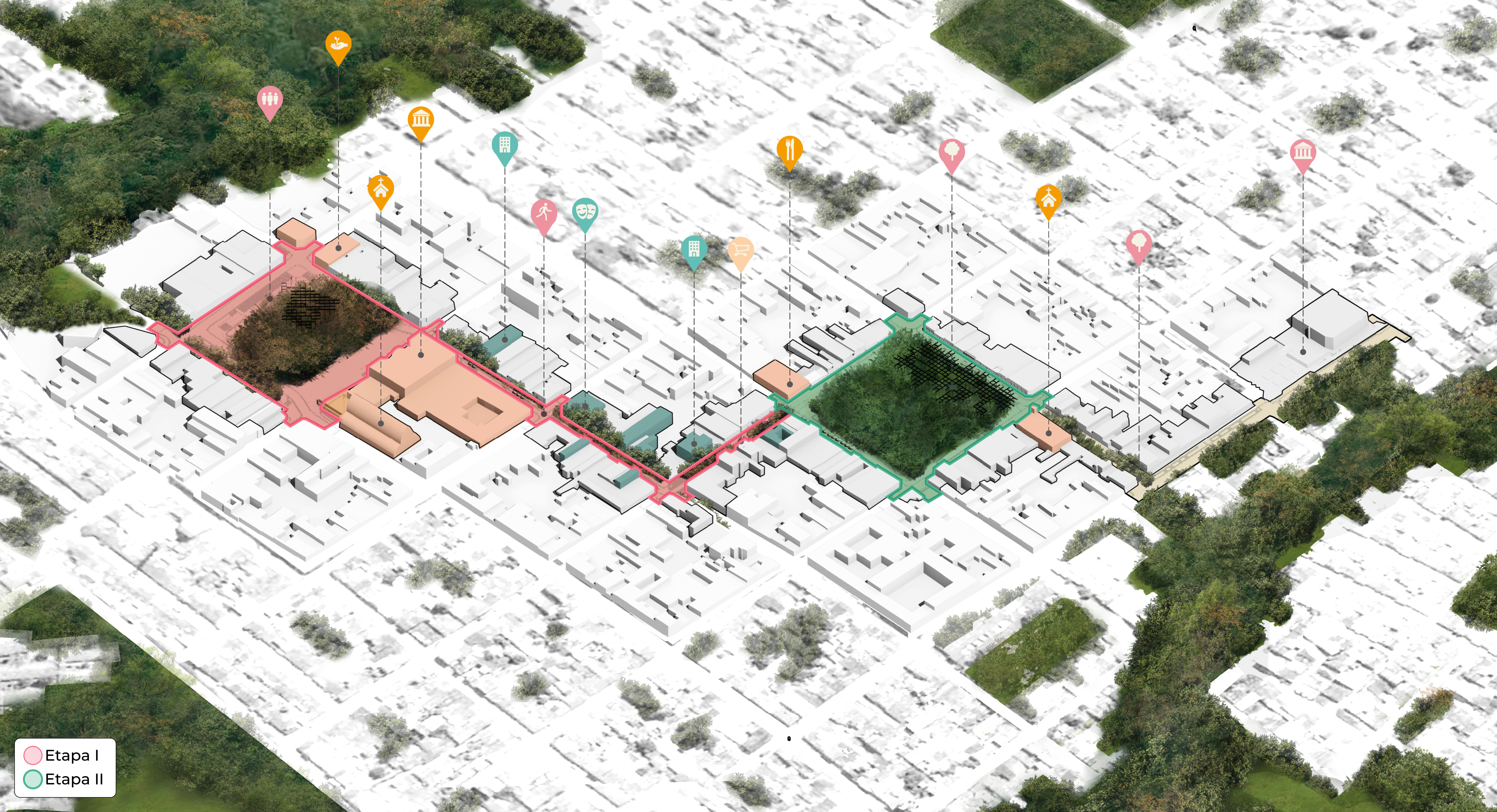 Para esto se adecúa todo el espacio público a un solo nivel, eliminando barreras arquitectónicas y desincentivando el uso del vehículo, procurando que el diseño genere una movilidad sostenible, que promueva los viajes a pie y en bicicleta, con las condiciones óptimas para ello.