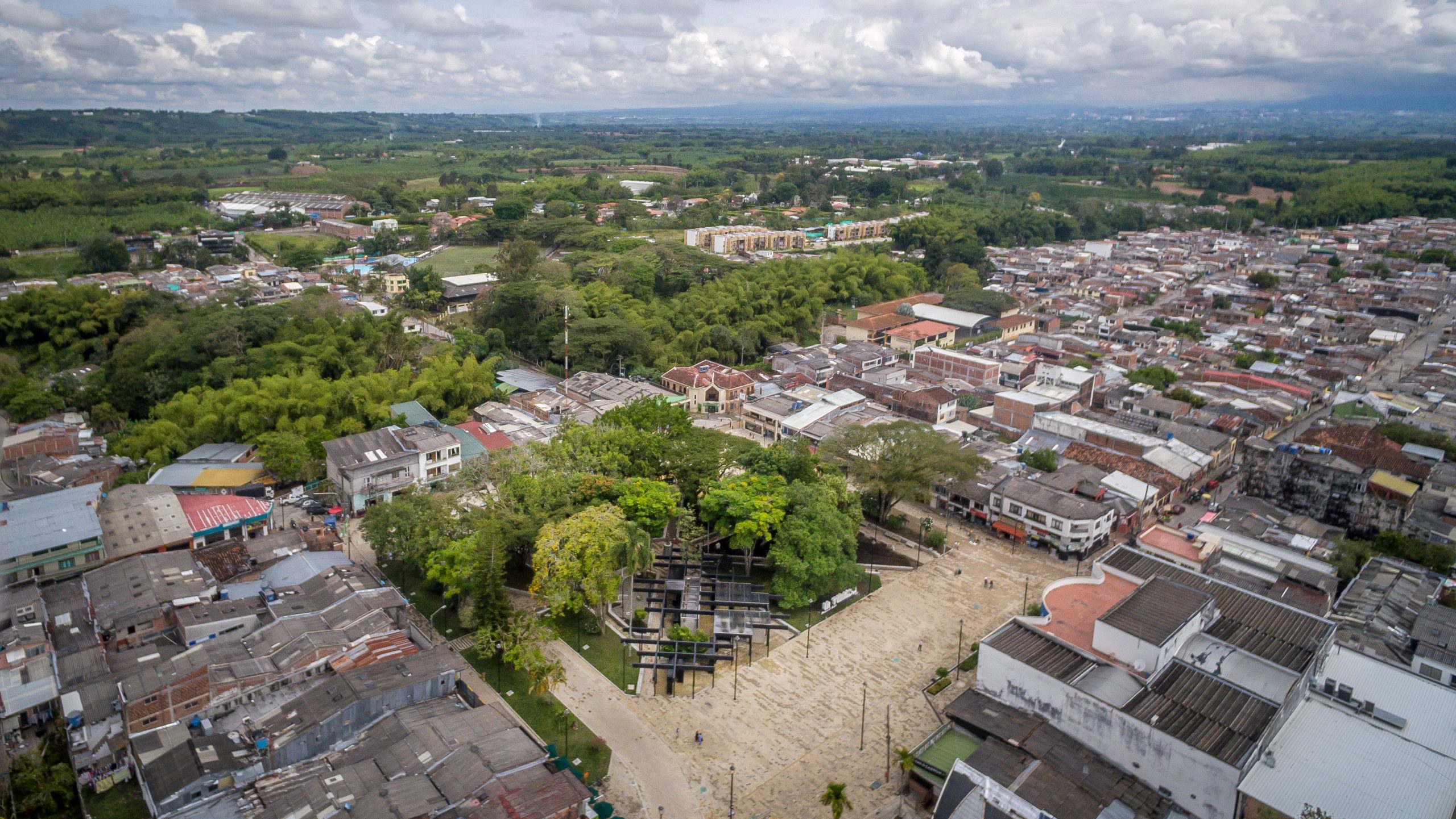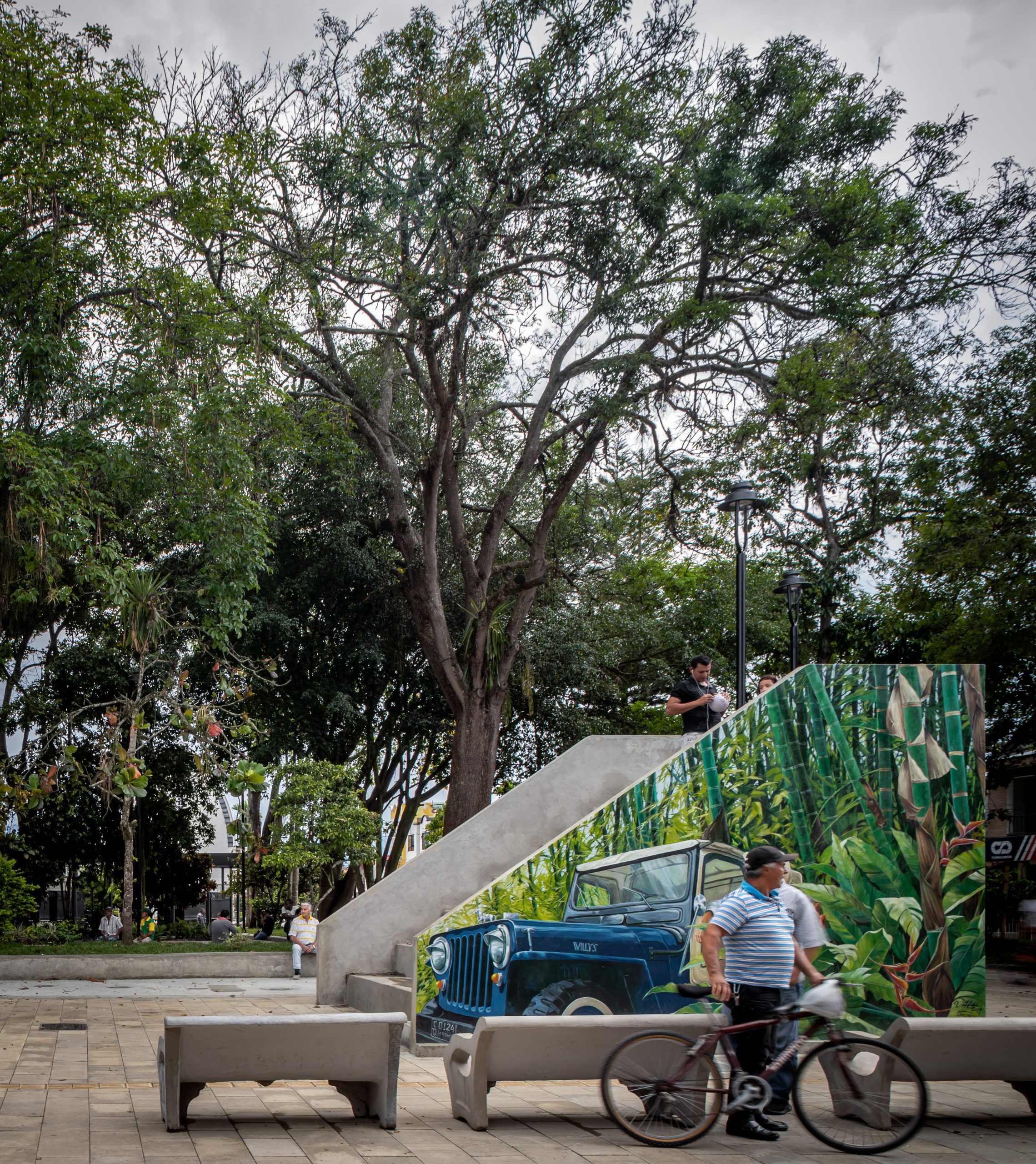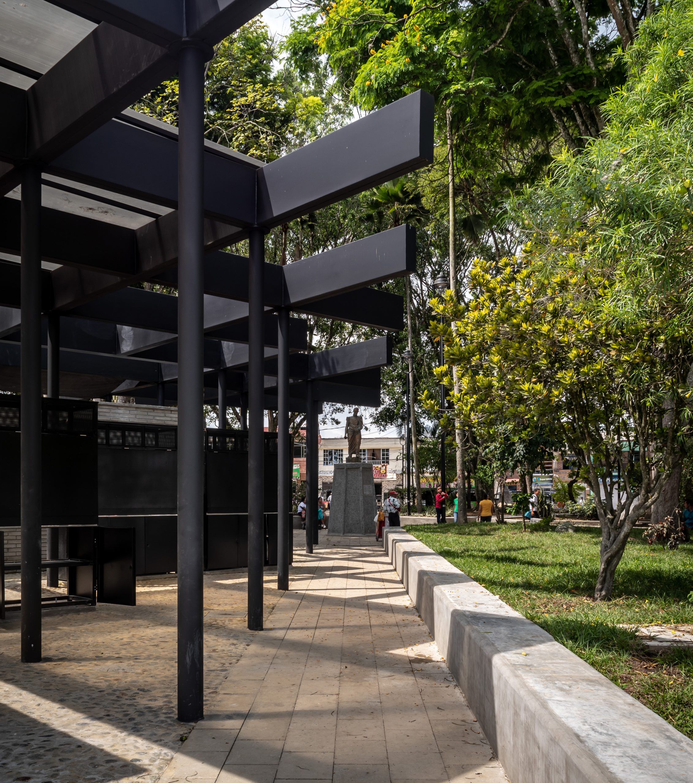 La intervención, dividida en dos etapas, comprende el diseño de las dos plazas principales del municipio y su conexión. Con un área aproximada de 24.000 m² de espacio público, donde el paisaje natural es el principal actor. Está dotada de nuevo mobiliario urbano, módulos de ventas comerciales, módulos de servicios básicos y, a modo de hito, en cada plaza se ubica una pérgola, cuyo diseño rememora la perfección del trazado en damero del municipio. Estas plazas se encuentran en la parte central de La Tebaida y son de gran impacto en la vida urbana de todos sus habitantes, por lo que el espacio público se convierte en una plataforma activa para el desarrollo de una vida ciudadana agradable. La primera etapa del proyecto contempla el sector de la Plaza Bolívar, espacio fundacional del municipio, y el sector de Conexiones, corredor peatonal de tres cuadras de longitud.