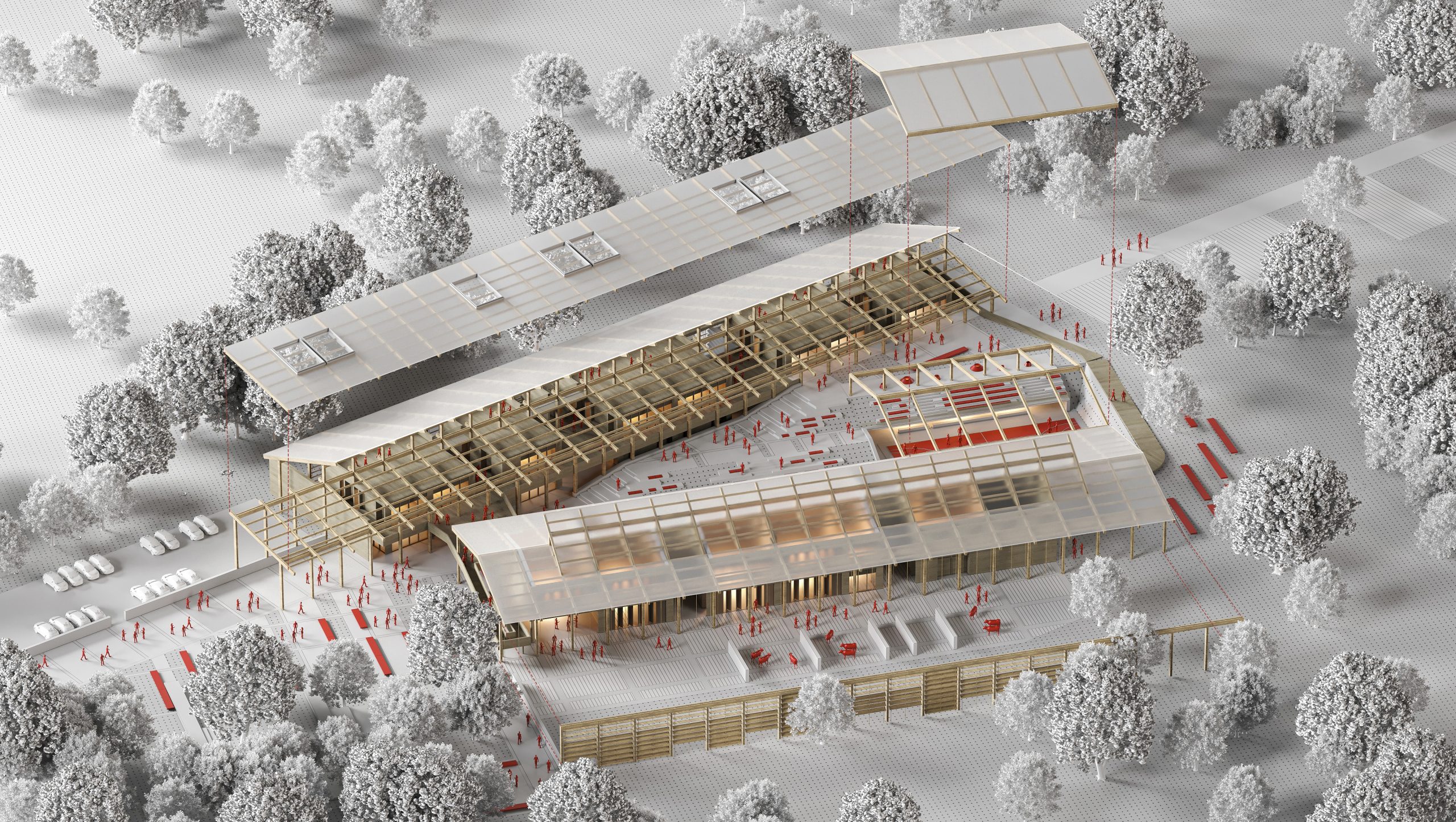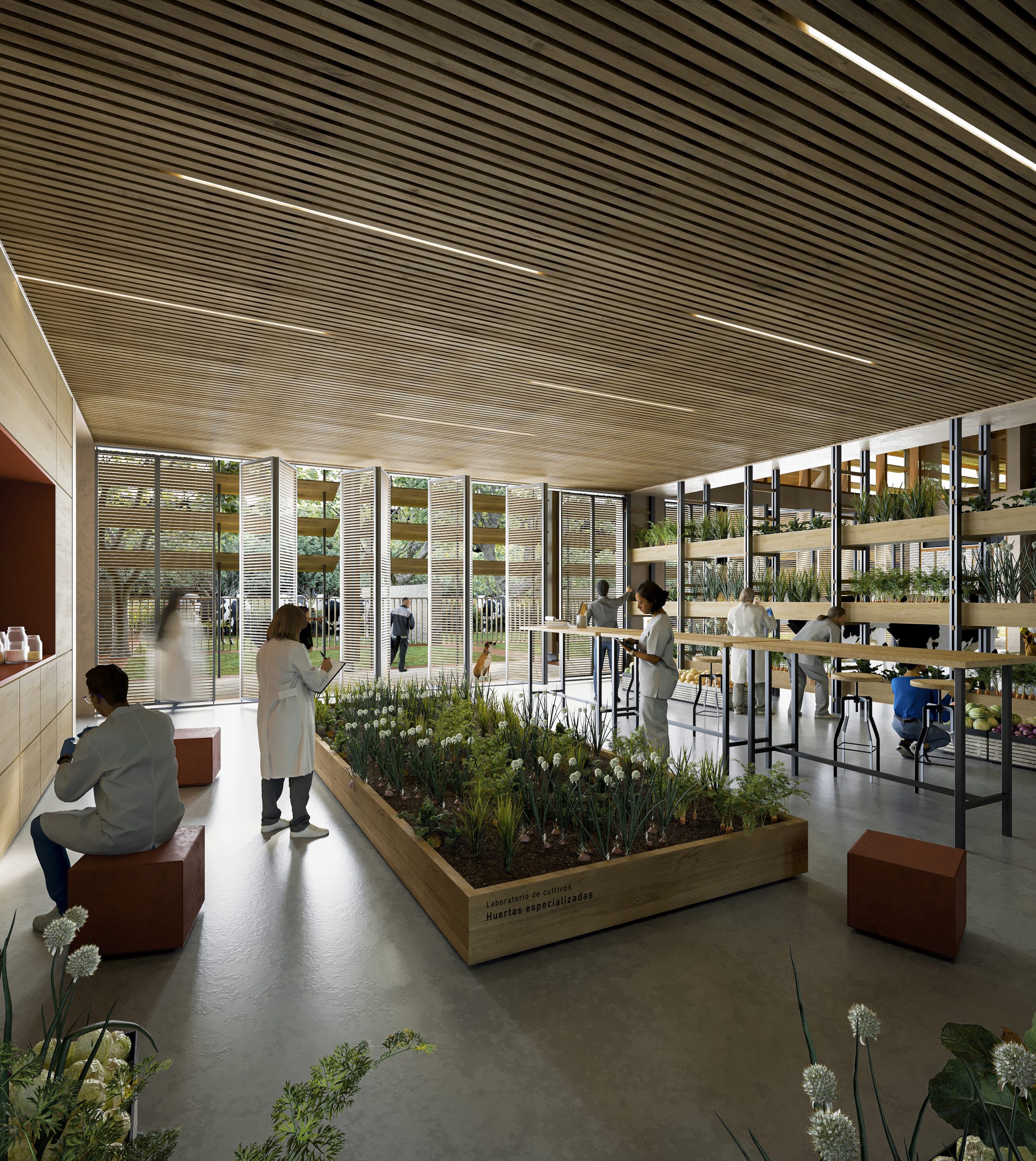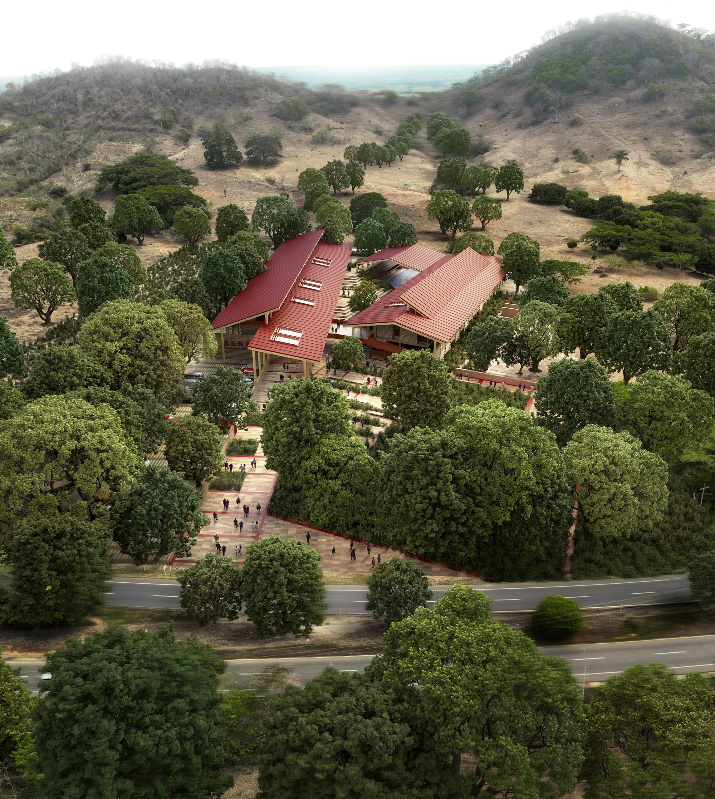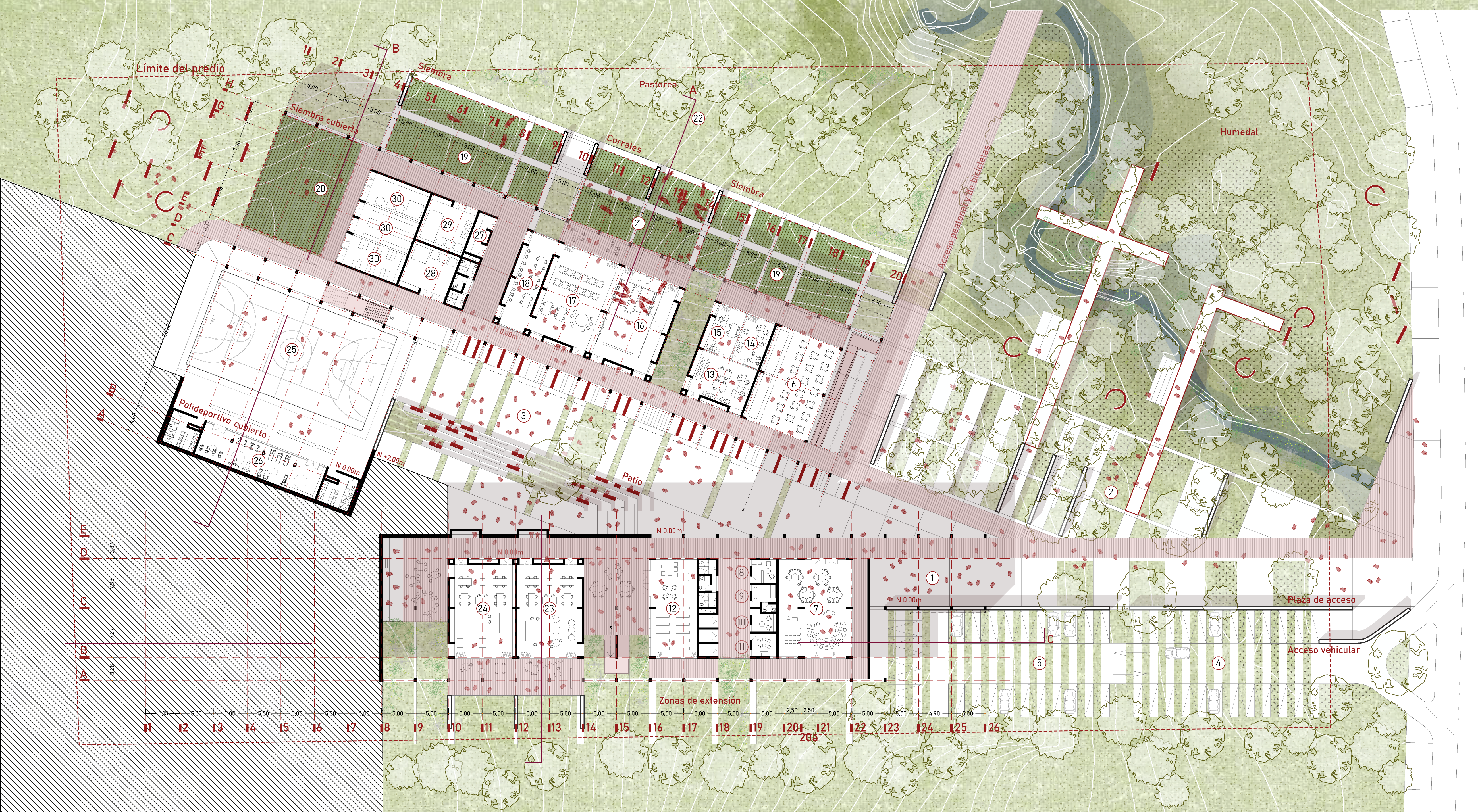 Para la concepción de la propuesta se establecieron cuatro premisas. 1. Continuidad del paisaje: Los volúmenes se disponen de manera paralela, alineándose con las visuales hacia los cerros cercanos y el humedal. 2. Doble membrana: La organización espacial de los edificios educativos se basa en bloques cubiertos por una doble membrana de madera, creando un filtro entre el interior y el exterior. 3. Aulas abiertas: Las actividades educativas que requieren una conexión directa con el entorno natural, están diseñadas para extenderse hacia el exterior. 4. Construir la sombra: El concepto de la cubierta como una gran sombra es central en el diseño.